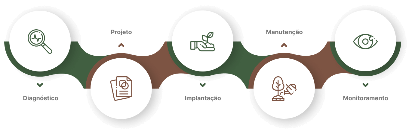 Nossa equipe proporciona uma abordagem completa, garantindo resultados em todas as etapas do processo de restauração: estudo preliminar da área; preparo do solo; plantio de nativas; manutenções; monitoramentos; atendimento aos indicadores ecológicos.
