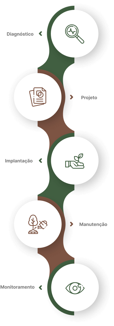 Nossa equipe proporciona uma abordagem completa, garantindo resultados em todas as etapas do processo de restauração: estudo preliminar da área; preparo do solo; plantio de nativas; manutenções; monitoramentos; atendimento aos indicadores ecológicos.